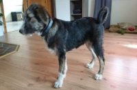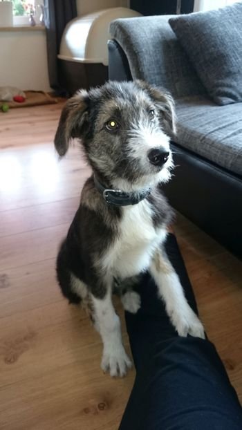 Tommy ist ein sehr freundlicher Hund, hat schon erste Kommandos gelernt. Vom Typ her erinnert er an einen zu kleinen Irish Wolfhound, aber auch Schnauzer könnte in seiner Ahnenreihe vertreten sein.